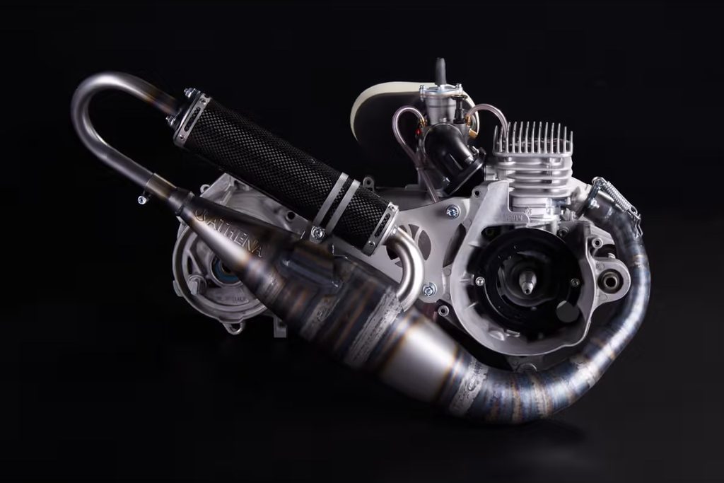 This scooter exhaust is developed and tested on the dyno, along with the Athena Ø47.6 mm Big Bore thermal unit with cylinder head for air-cooled, vertical Yamaha/Minarelli engines and the range of Athena accessories specific to these applications, such as air filters, the Big Valve System, the PWK carburetor and the racing driveshaft.