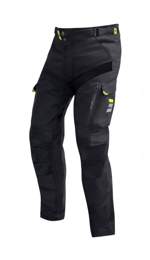ballistic panel Reinforced rear saddle panel Vented pockets on the front 2 big Waterproof pockets on thighs Reflective inserts for a better visibility Removable inner liner Waist and lower legs adjustable by