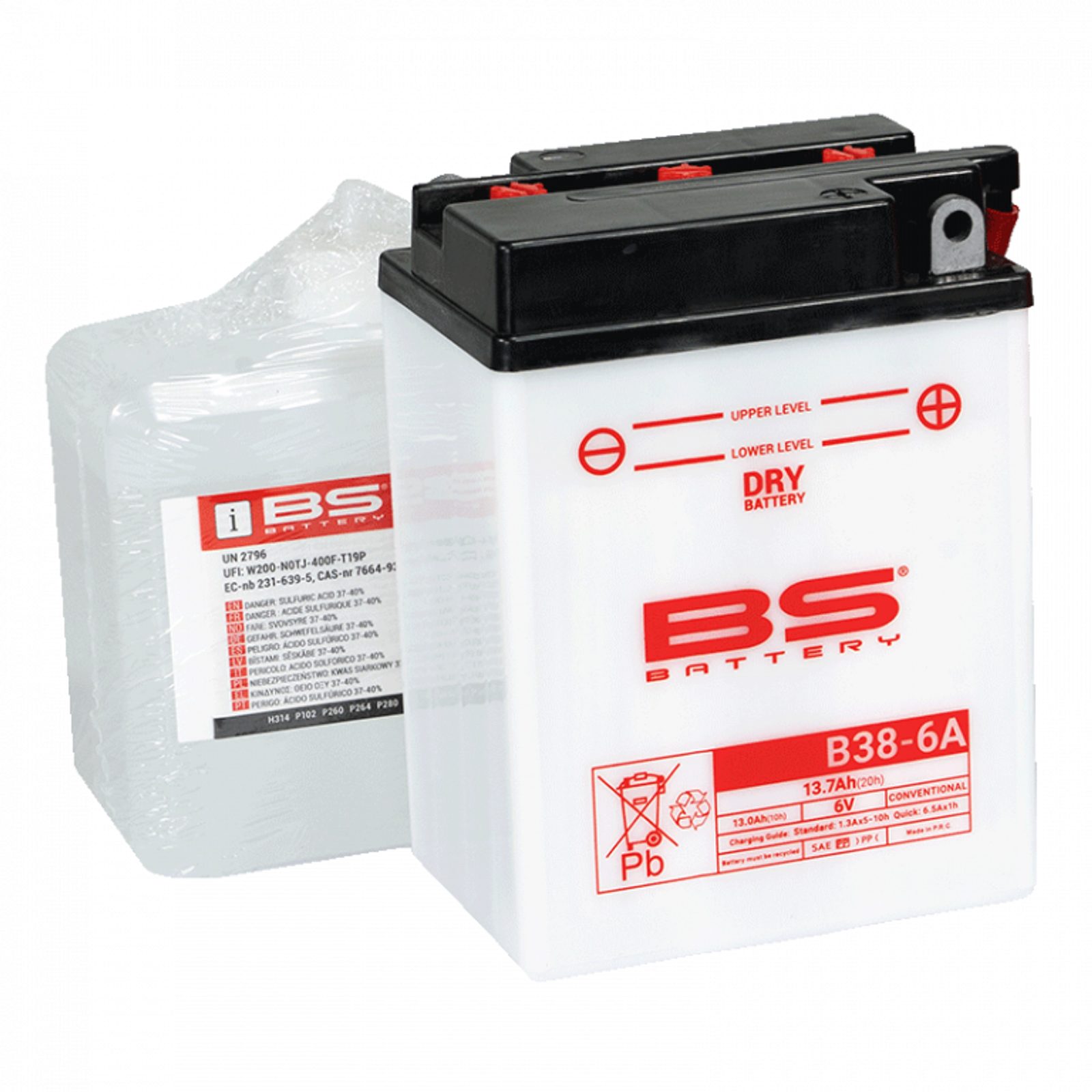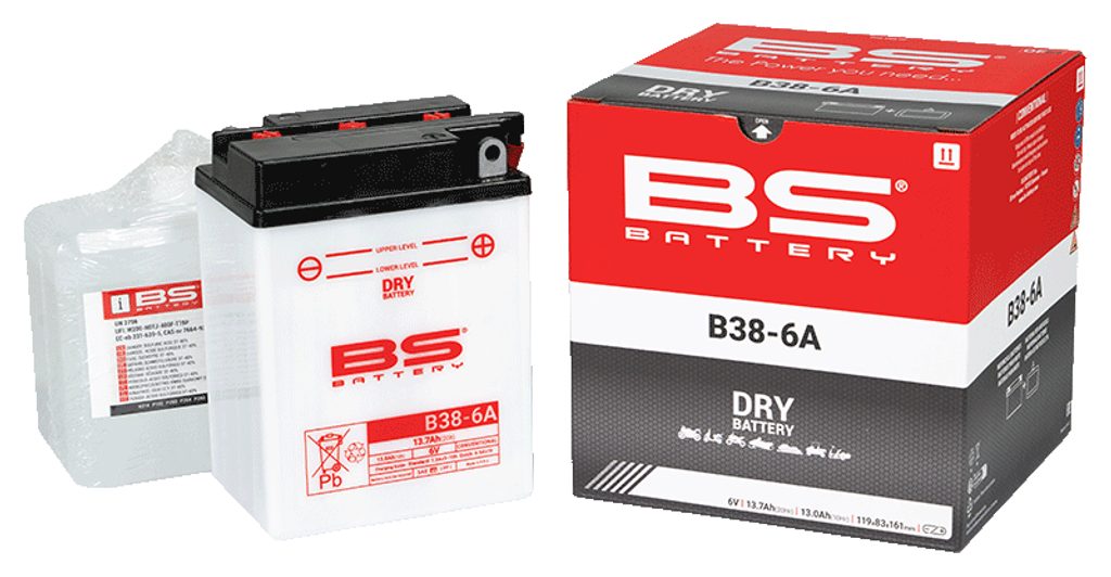 B38-6A battery is part of our DRY range. Specially designed to offer good performance and reliability, this 6V 13.7Ah conventional battery is delivered with an acid pack, must be activated before first use and has to be checked periodically. With DRY technology, this battery does not require maintenance during a long storage period.