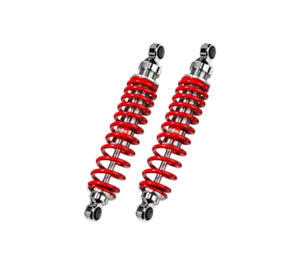 Designed for "classic" bikes twin rear shocks, specif adjustment for each application, available in different versions; "03" all chrome more classic models bike and "02V2" total black. This shock improves riding comfort and vehicle control thanks to its internal hydraulic system. The linear or progressive springs are chosen depending on the type of vehicle application. Stepless spring preload grant wide adjustment range and excellent performance, for use with only the rider or under full load.