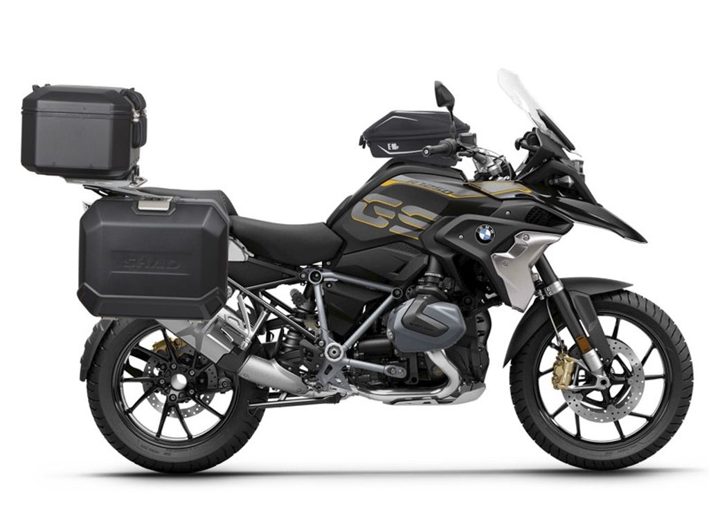 The complete set of cases SHAD TERRA BLACK includes black aluminum top case TR37 with a capacity of 37L, black aluminium left case TR47 with a capacity of 47L and a smaller black right case TR36 with a capacity of 36L due to the location of the exhaust. The right suitcase will not protrude. The set contains everything you need to mount both suitcases to the motorcycle.