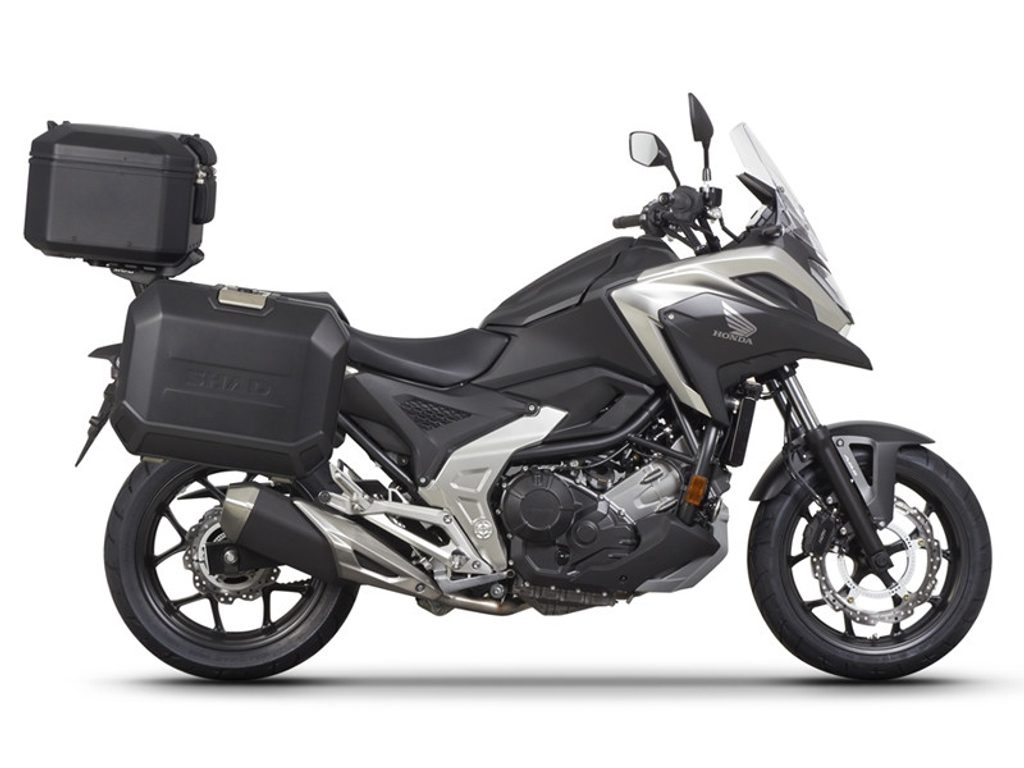 The complete set of cases SHAD TERRA BLACK includes black aluminum top case TR37 with a capacity of 37L, black aluminium left and right case TR47 with a capacity of 47L. The set contains everything you need to mount both suitcases to the motorcycle.