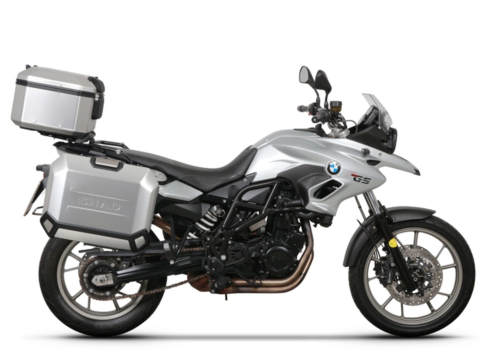 The complete set of cases SHAD TERRA includes aluminum top case TR48 with a capacity of 48L, aluminium right case TR47 with a capacity of 47L and a smaller left case TR36 with a capacity of 36L due to the location of the exhaust. The left suitcase will not protrude. The set contains everything you need to mount both suitcases to the motorcycle.