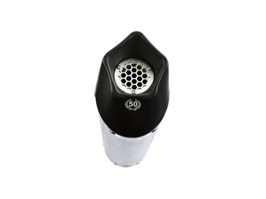 GPR's New Grand Prix Evo Titanium - the Silencer is conical, with a special shape starting from a diameter 90mm to arriva at 130mm of circonference and lenght that depend from the motorbike of destination. It has a sleever made in titanium realized with natural color, black endcap made through CNC machining with pentagonal exit and dbkiller.