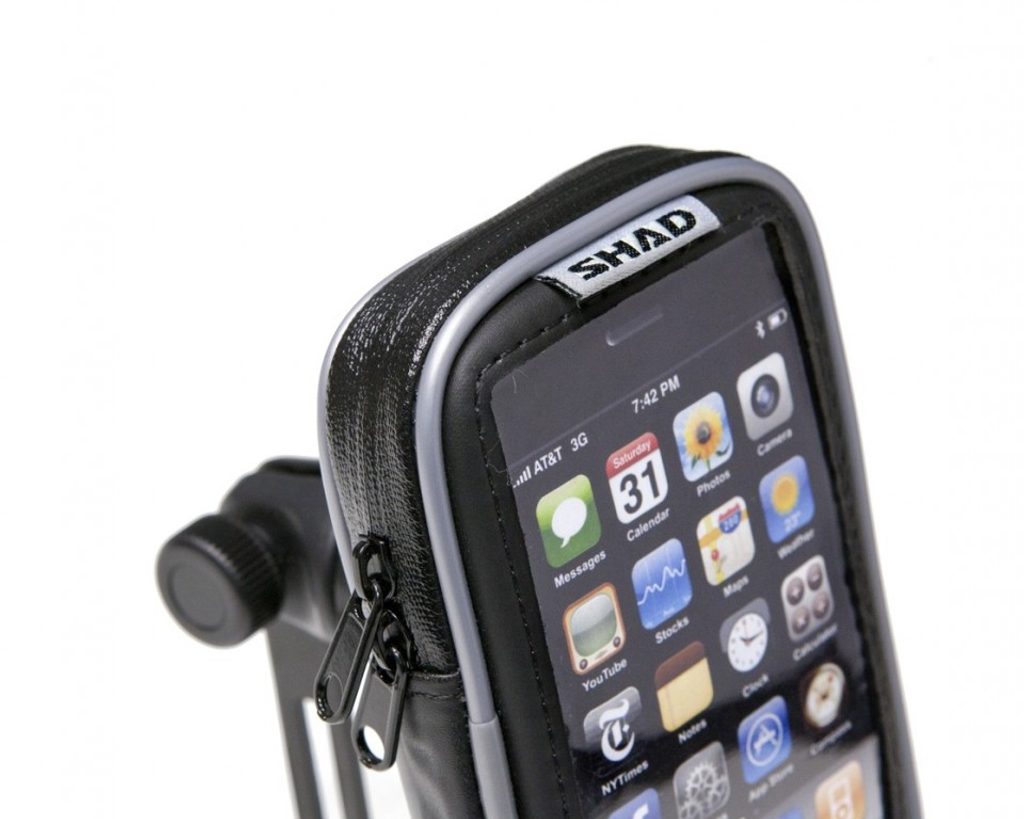 Your Smartphone is carried in an extremely sturdy, practical case whose interior is lined with knock-proof material. Depending on the version, the holder can be fixed to the handlebar or to the mirror simply and quickly, thanks to a practical, adjustable bracket. Since the base can be rotated 360°, you can position the screen at the visual angle that is just right for you. The waterproof case and zips enable the case to be used in any weather, and your touch screen display is completely functional through the special crystal film window.