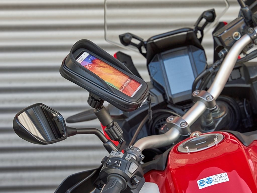 Smartphone holder compatible with all motorcycles. Quick and easy to install to the mirror, thanks to its universal mounting system, adjustable even with gloves. Antiglare visor, reinforced cable outlet and internal shims for different phone sizes. Safety strap included.